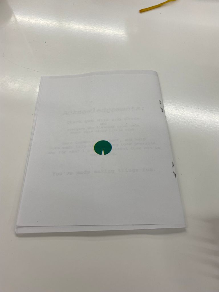 I used my friend’s boss’s printer to print my zine (they’re the coolest and I love them). This involved sending the rough print layout as a pdf to the shop’s staff email and then they printed it for me. I messed up the first time around, so I printed just one copy of the zine and went back home to correct my mistake. Something I did to make my life easier, was to center the pictures and text and to leave a larger margin so that I could cut the page if I needed to. If one needs a takeaway on printing, be sure to correct it quickly and early on, and pay attention to your margins.