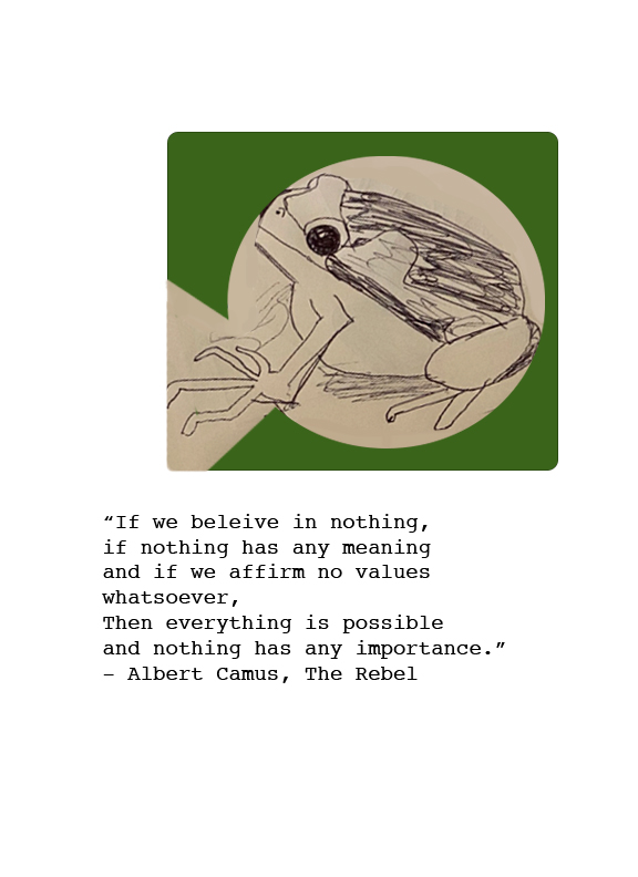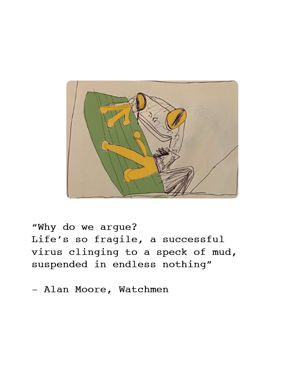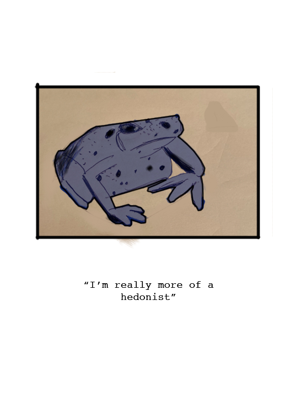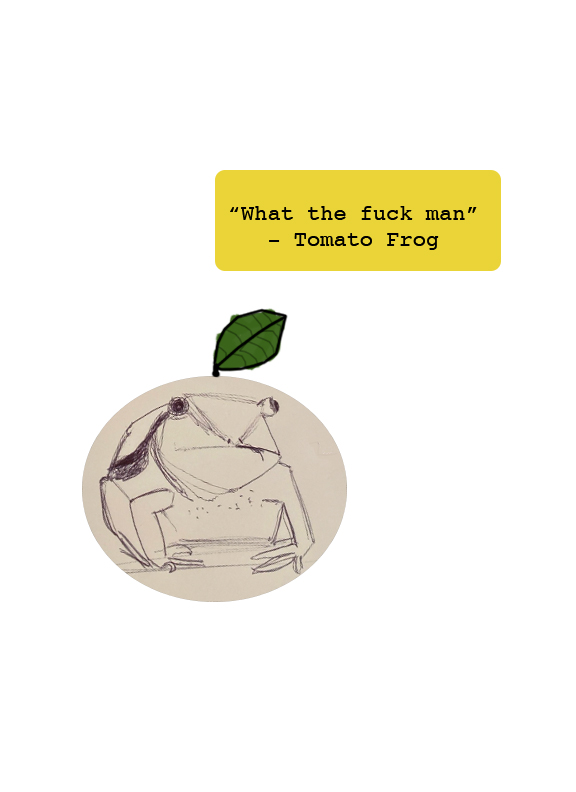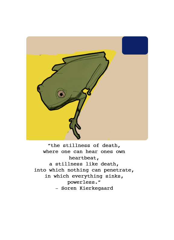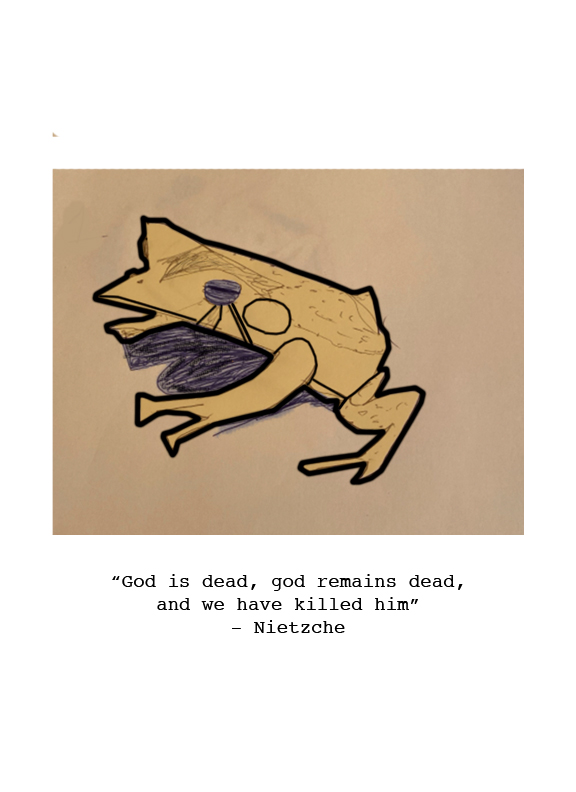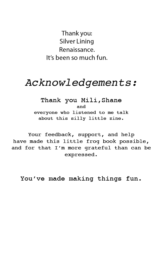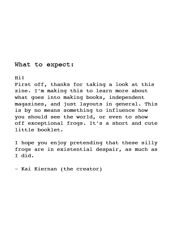 I started making zines around 3 months ago. Nihilist Frogs was the first idea I had about what I would want to see in a zine form, and I’m so glad I finished it. I sell copies of this, but I’m going to put it up on this website so that I can send it over to friends, co-workers, and maybe put it up as a portfolio piece.